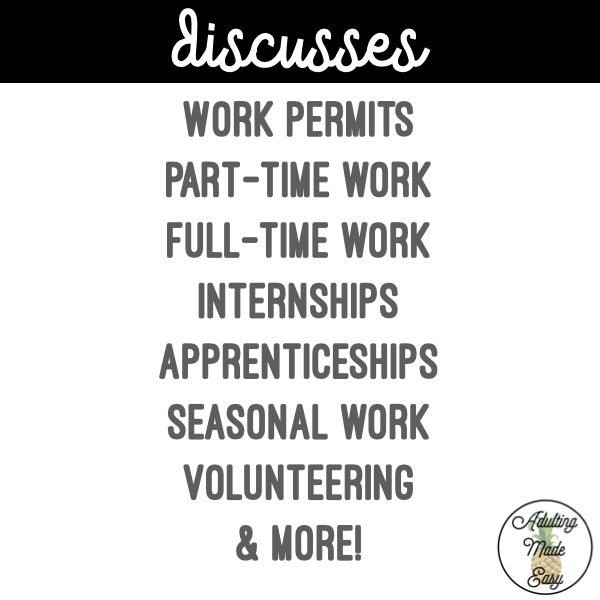 - 23 pages of narrative discussion on work permits, part-time work, full-time work, internships, apprenticeships, seasonal work, volunteering, and much more.