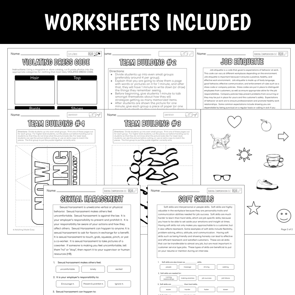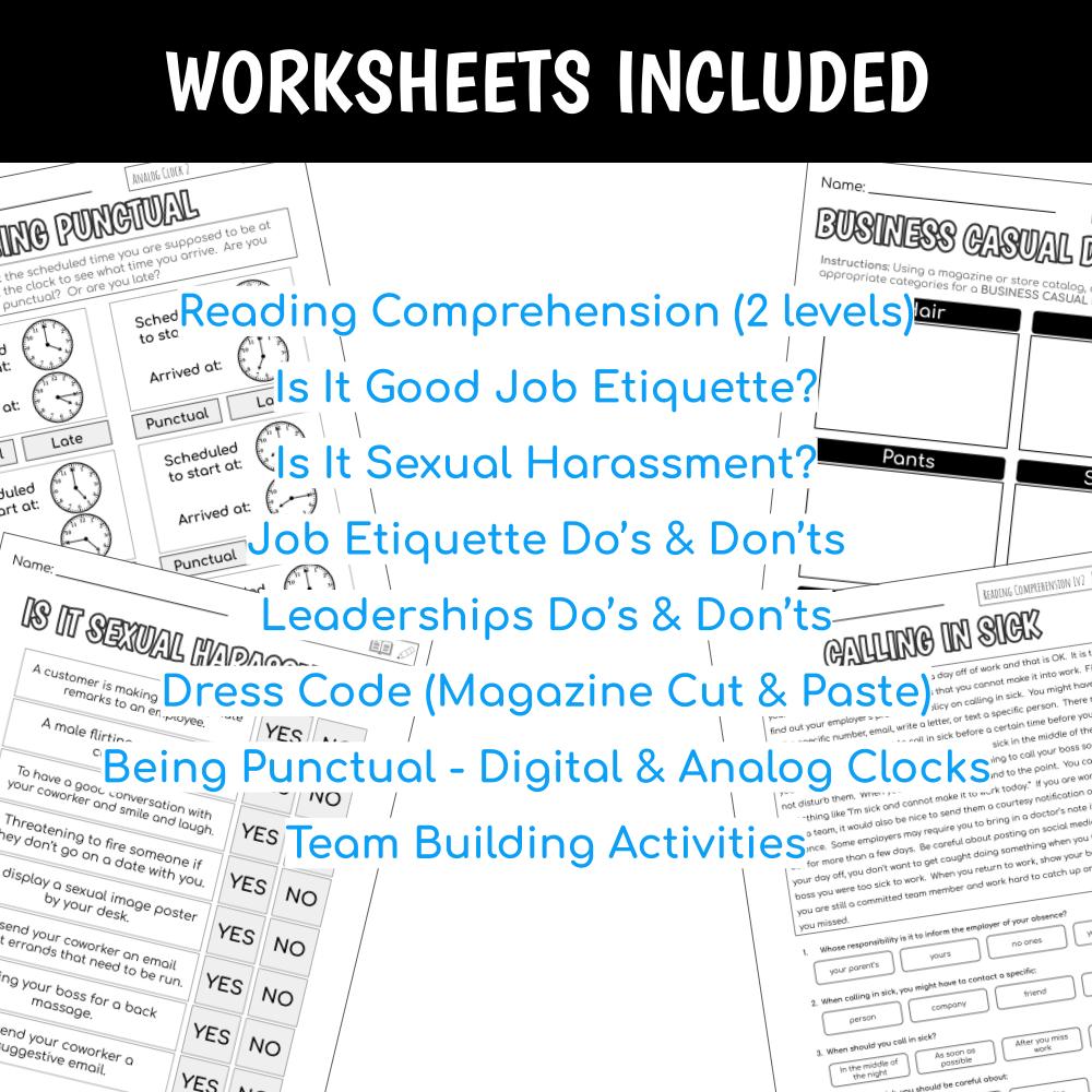 This unit focuses on vocational vocabulary and job etiquette skills. Basic concepts of calling in sick, being punctual, dress code, being ethical, sexual harassment, teamwork, and soft skills are covered through visual lecture, cut & paste, tracing, reading comprehension, writing sentences, functional worksheets and more.