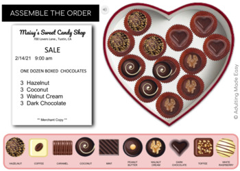 Differentiated digital task box activity – Valentine’s Day themed activity to practice fulfilling chocolate gift box orders! Features a box with room for a dozen chocolates, chocolate liners, and an assortment of 10 different chocolates!