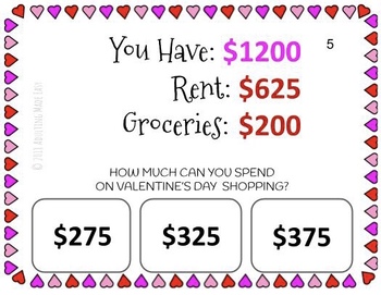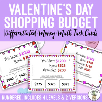 Valentine’s themed Differentiated life skills Money Math visual word problems to practice real-world Subtraction for special education. Includes one, two, and three-step subtraction problems with field of 3 answers. Students can learn the basics of budgeting and consumer math through these simple subtraction color-coded problems.