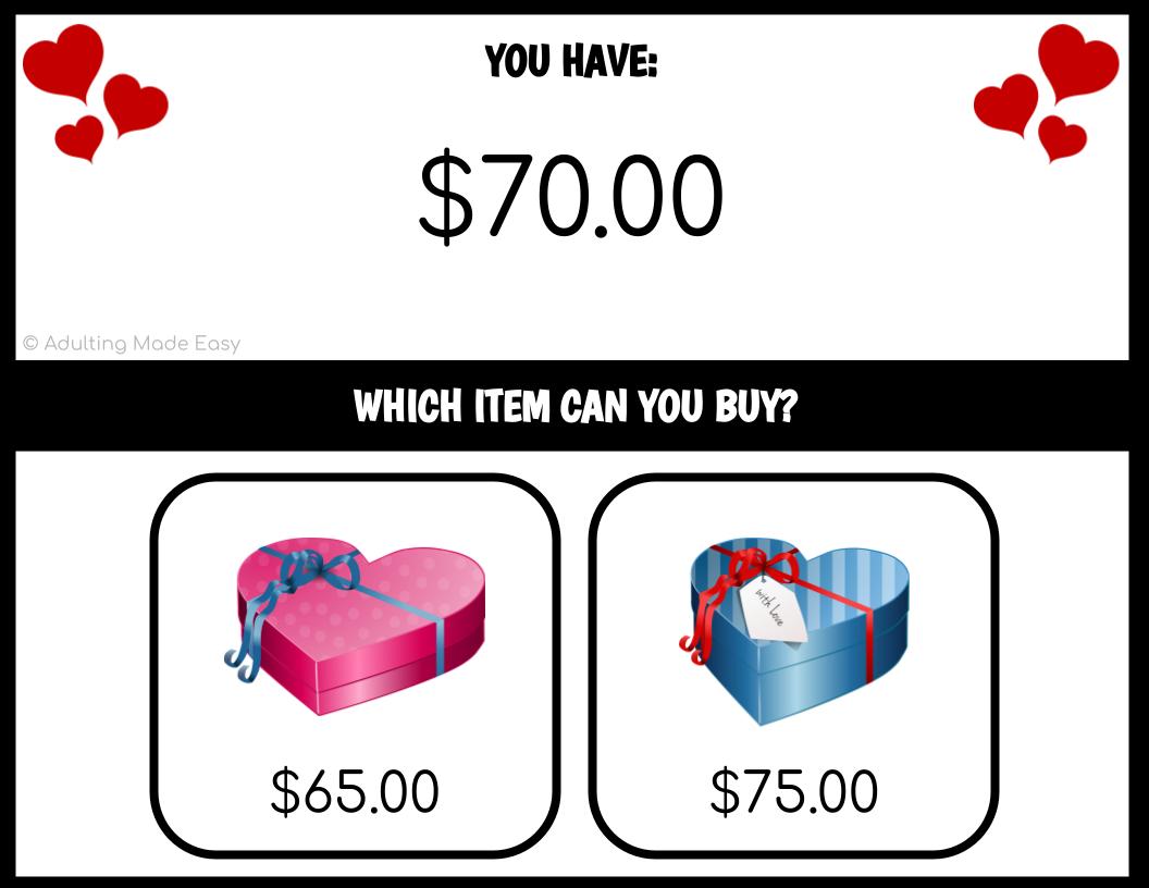 Students practice real-world consumer math by deciding which Valentine’s gift they can afford based on a given budget. This interactive, visually-supported activity helps build money math, life skills, and vocational skills—perfect for special education and visual learners. Themed for February, love, and store shopping.