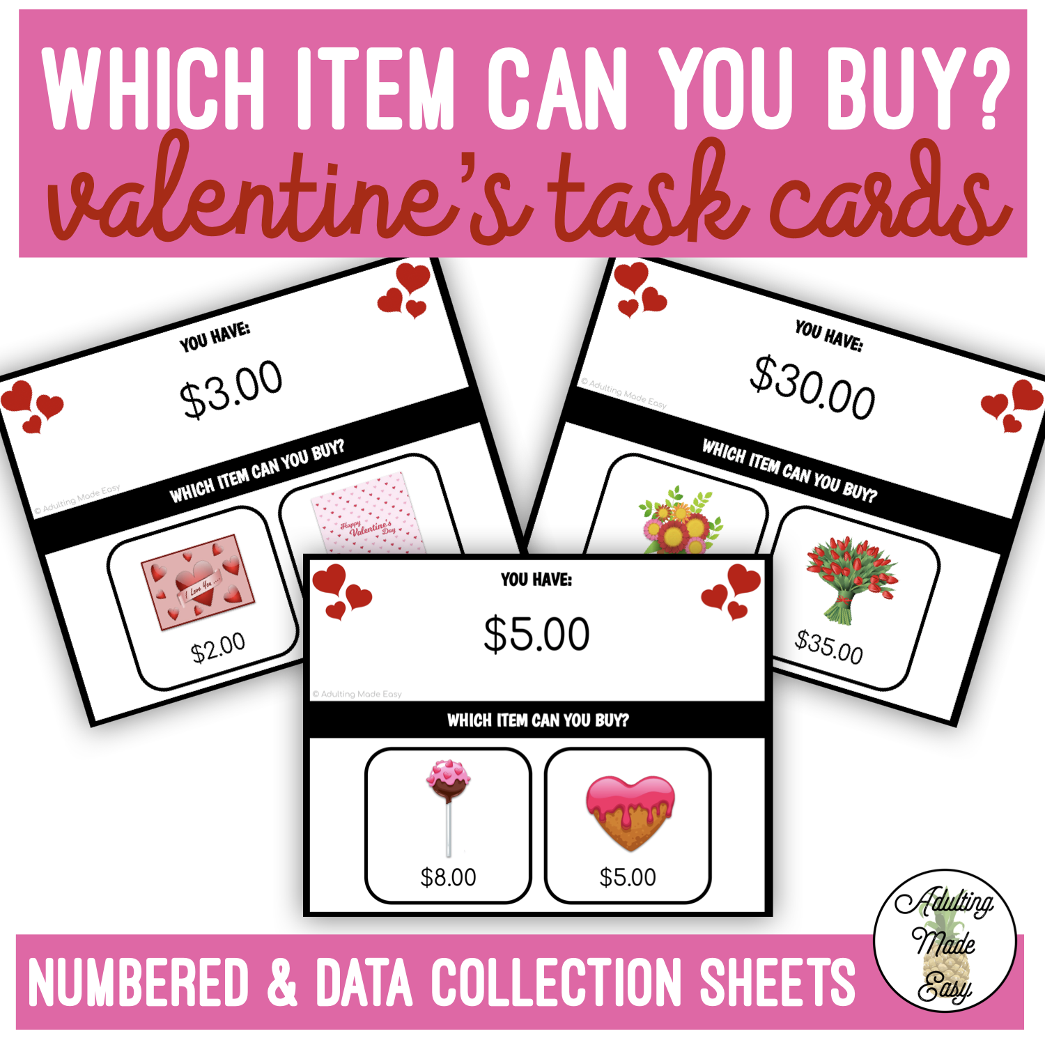 Valentine gift shopping, student will determine which item they can purchase given how much money they have. consumer math . Which one costs less?