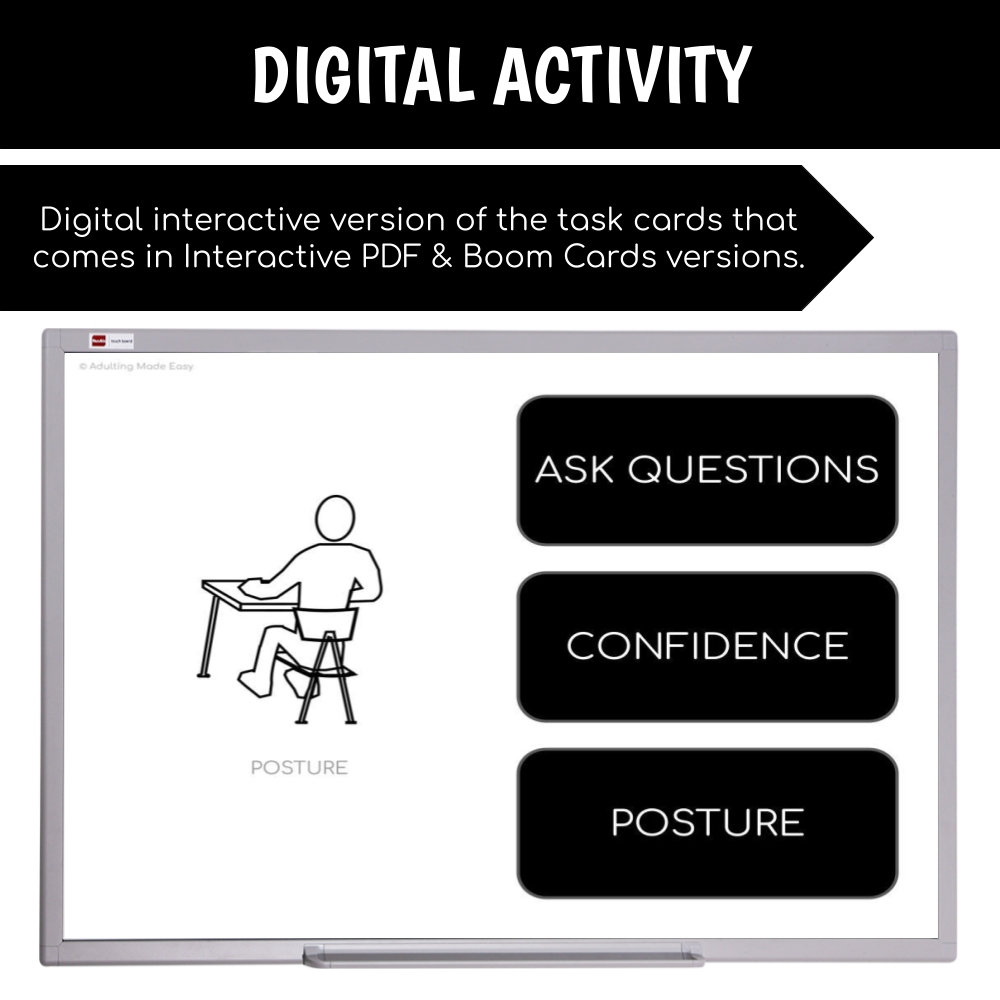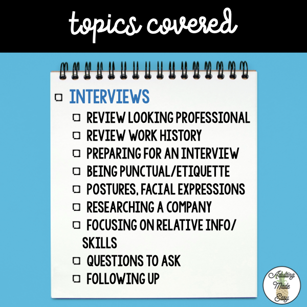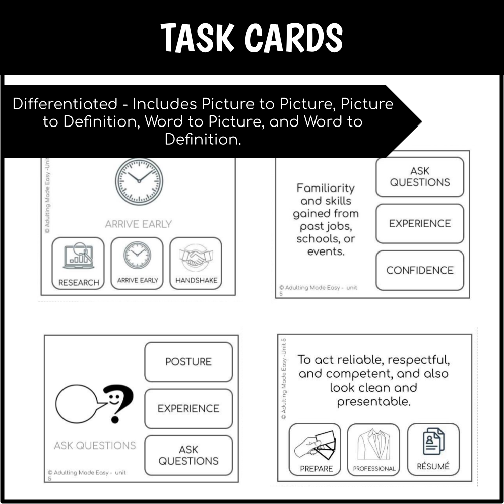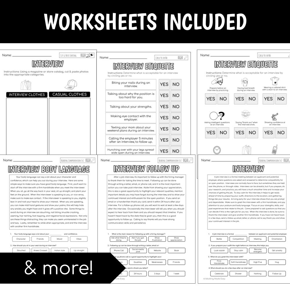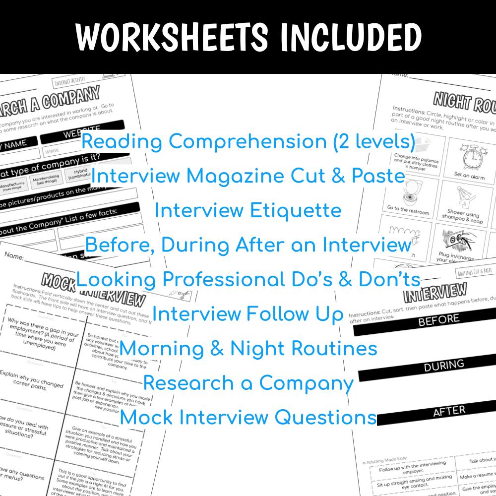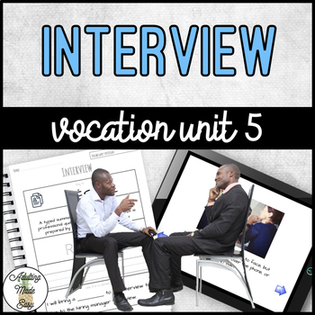 This unit focuses on pre-vocational vocabulary and skills of preparing for an interview. Basic concepts of interview preparation, posture and questions to answer during an interview, and following up after an interview are covered through visual lecture, cut & paste, tracing, reading comprehension, writing sentences, functional worksheets and more.