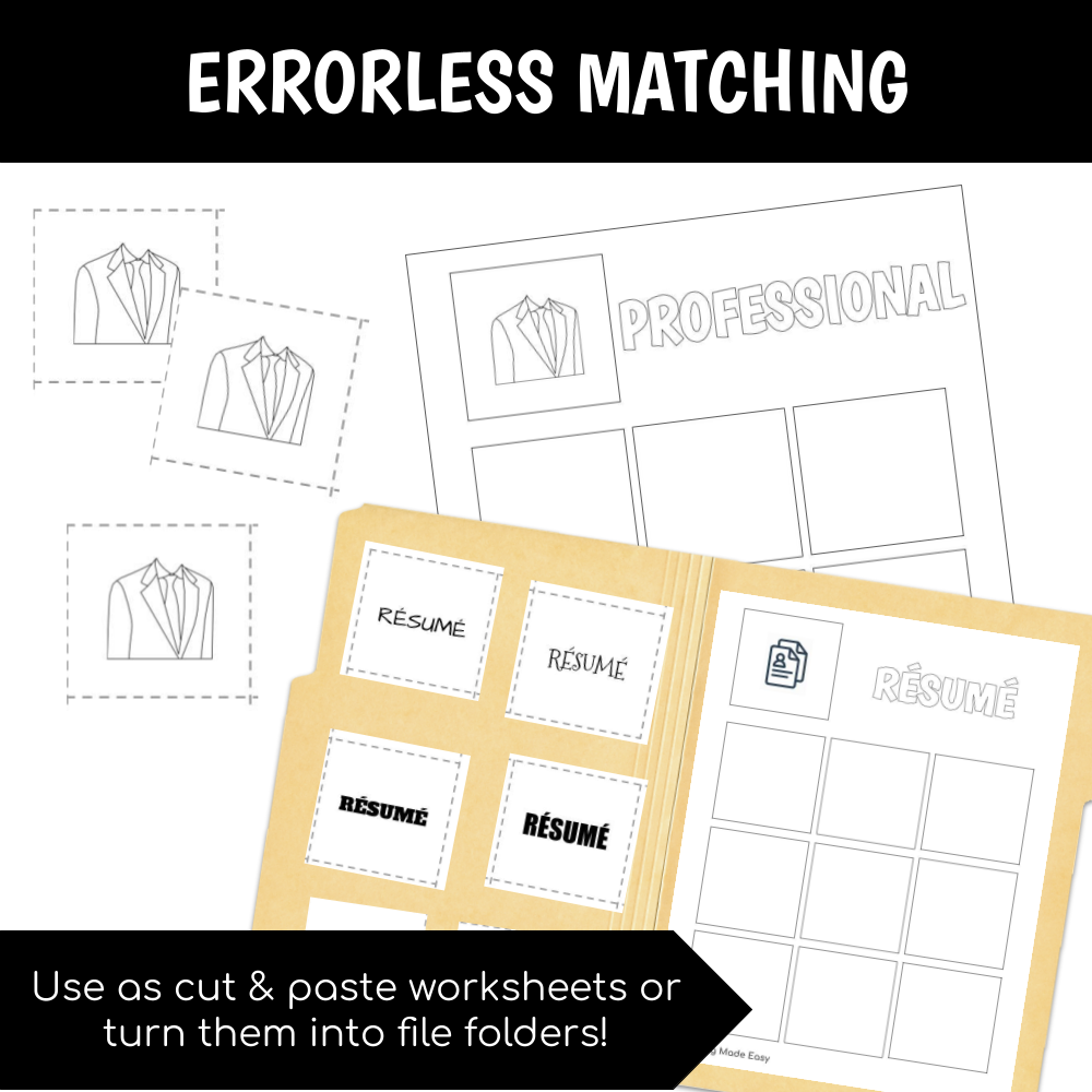 - Vocabulary Errorless Matching (12 boards) – Picture and word visuals. Can be used as cut & paste worksheets or turned into file folders.