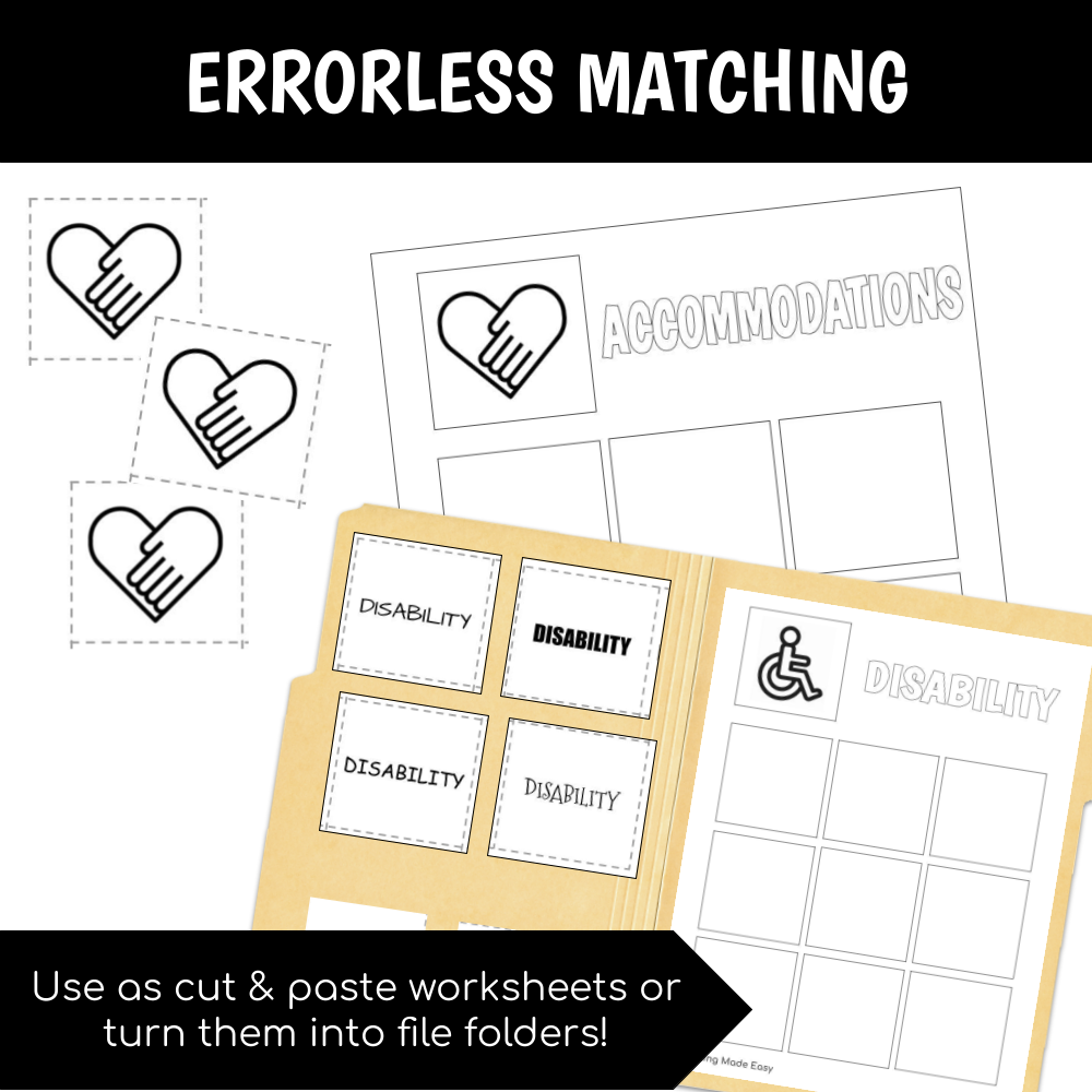 - Vocabulary Errorless Matching (6 boards) – Picture and word visuals. Can be used as cut & paste worksheets or turned into file folders.