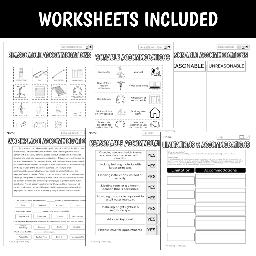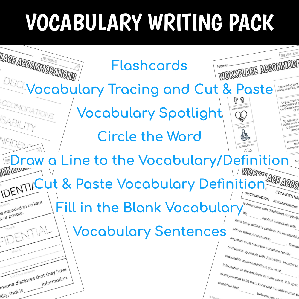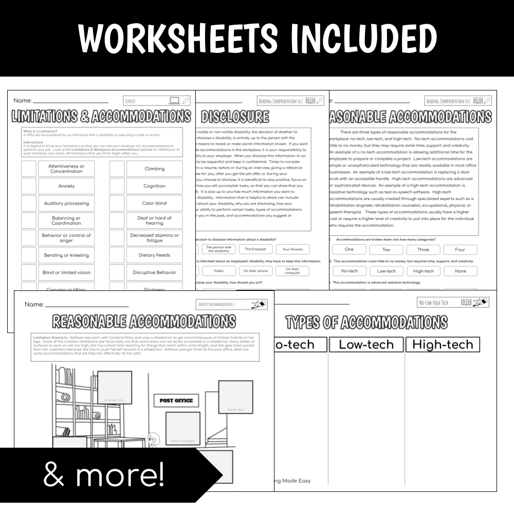 This unit focuses on pre-vocational vocabulary and skills on workplace accommodations. Basic concepts about disability in the workplace, disclosure, and reasonable accommodations are covered through visual lecture, cut & paste, tracing, reading comprehension, writing sentences, functional worksheets, typing activities and more.