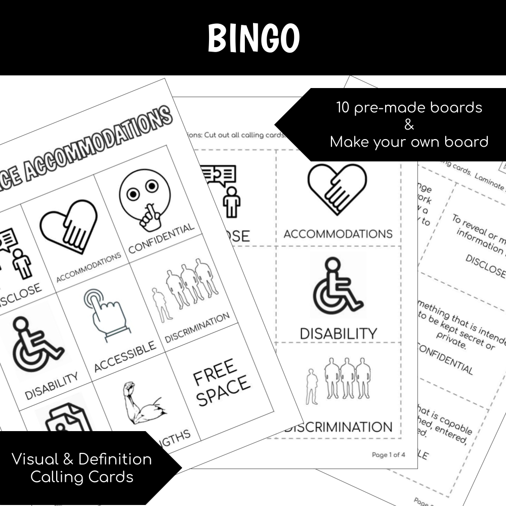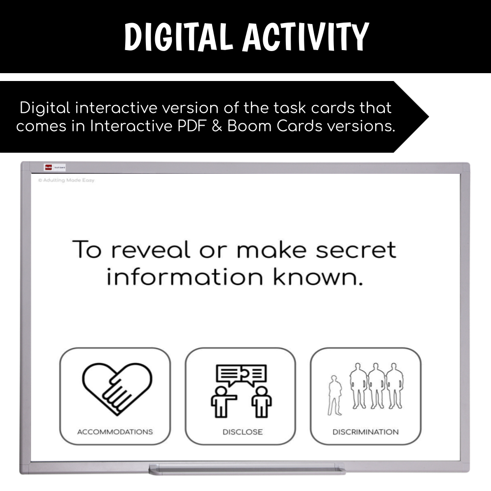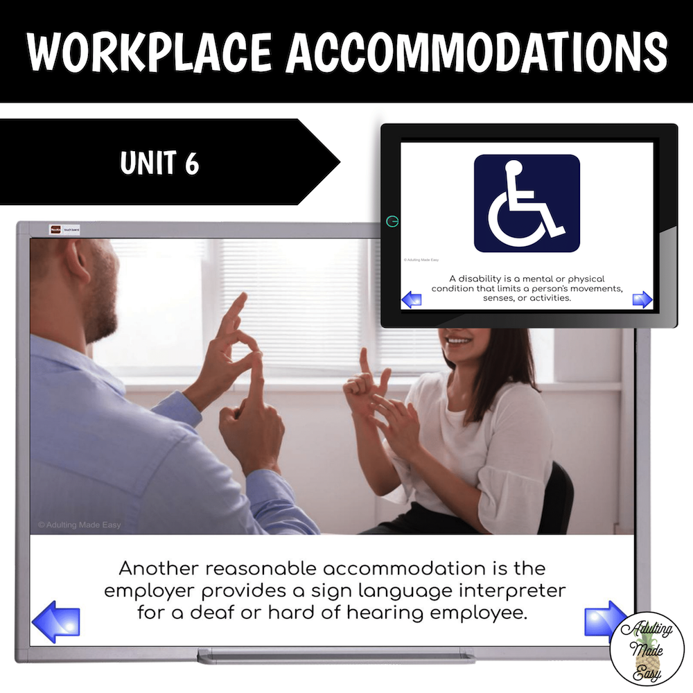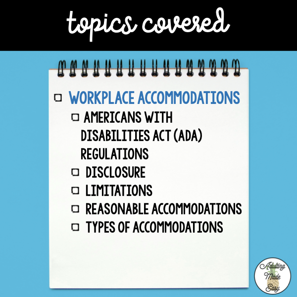 This unit focuses on pre-vocational vocabulary and skills on workplace accommodations. Basic concepts about disability in the workplace, disclosure, and reasonable accommodations are covered through visual lecture, cut & paste, tracing, reading comprehension, writing sentences, functional worksheets, typing activities and more.