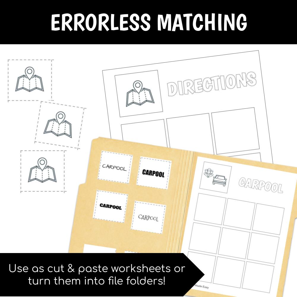 Vocabulary Errorless Matching (6 boards) – Picture and word visuals. Can be used as cut & paste worksheets or turned into file folders.