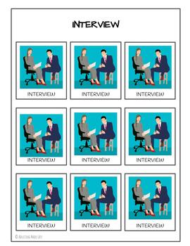 Vocabulary featured: Tasks, Sale, Wages, Prioritize, Website, Open, Closed, Sold, Business Hours, Business Card, Resume, References, Salary, Schedule, Transaction, Sort, Stock Shelves, Transportation, Timesheet, Teamwork, Meeting, Marketing, Now Hiring, Occupations, Office, On Time, Plan, Paycheck, Professional Attire, Quality Work, Employee, Email, Fax Machine, Internet, Interview, Job, Knowledge, Lunch Break, Letter of Recommendation, Manager, Application, Assemble, Bank Account, Customer, Cashier, Coworker, Clock In/Out, Career, Collaborate, Desk, Clearance, Discount, Union, and Vocation.