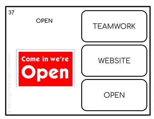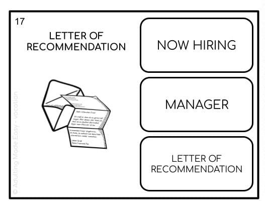 Vocabulary featured: Tasks, Sale, Wages, Prioritize, Website, Open, Closed, Sold, Business Hours, Business Card, Resume, References, Salary, Schedule, Transaction, Sort, Stock Shelves, Transportation, Timesheet, Teamwork, Meeting, Marketing, Now Hiring, Occupations, Office, On Time, Plan, Paycheck, Professional Attire, Quality Work, Employee, Email, Fax Machine, Internet, Interview, Job, Knowledge, Lunch Break, Letter of Recommendation, Manager, Application, Assemble, Bank Account, Customer, Cashier, Coworker, Clock In/Out, Career, Collaborate, Desk, Clearance, Discount, Union, and Vocation.