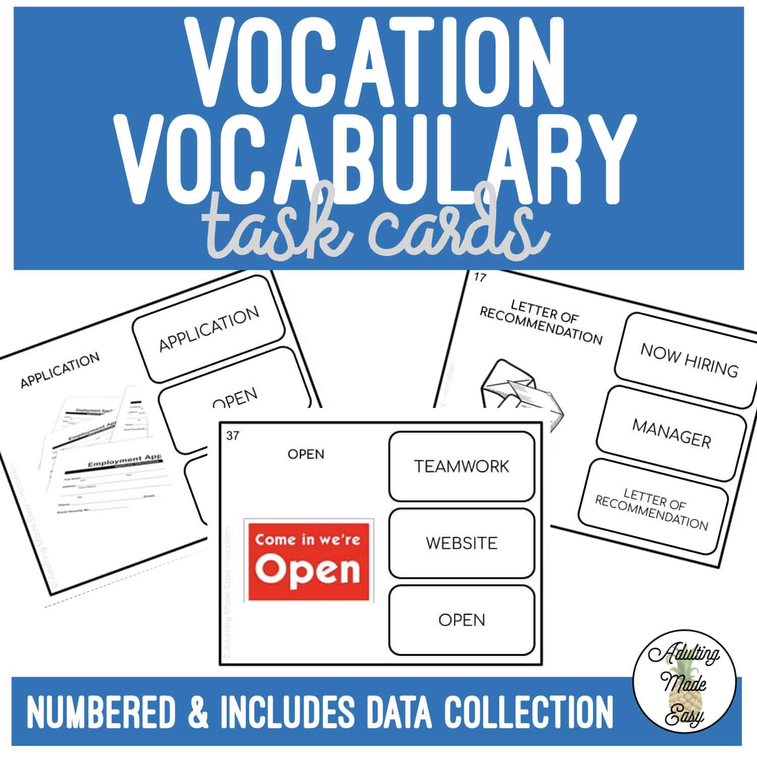 Career prep vocab words for special education. Visual functional reading activity for common job readiness terminology.