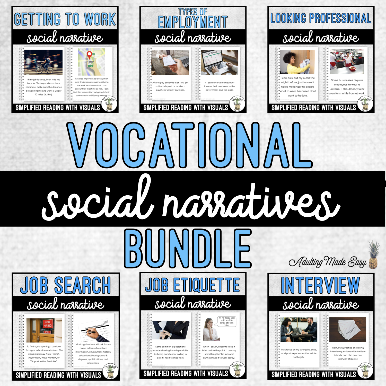 A money saving BUNDLE of simple stories with the visuals and language you need to talk to students about understanding the workplace, job skills, vocational skills.