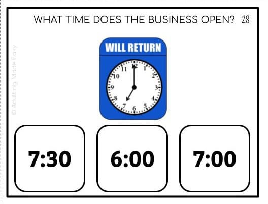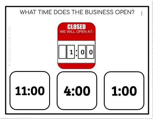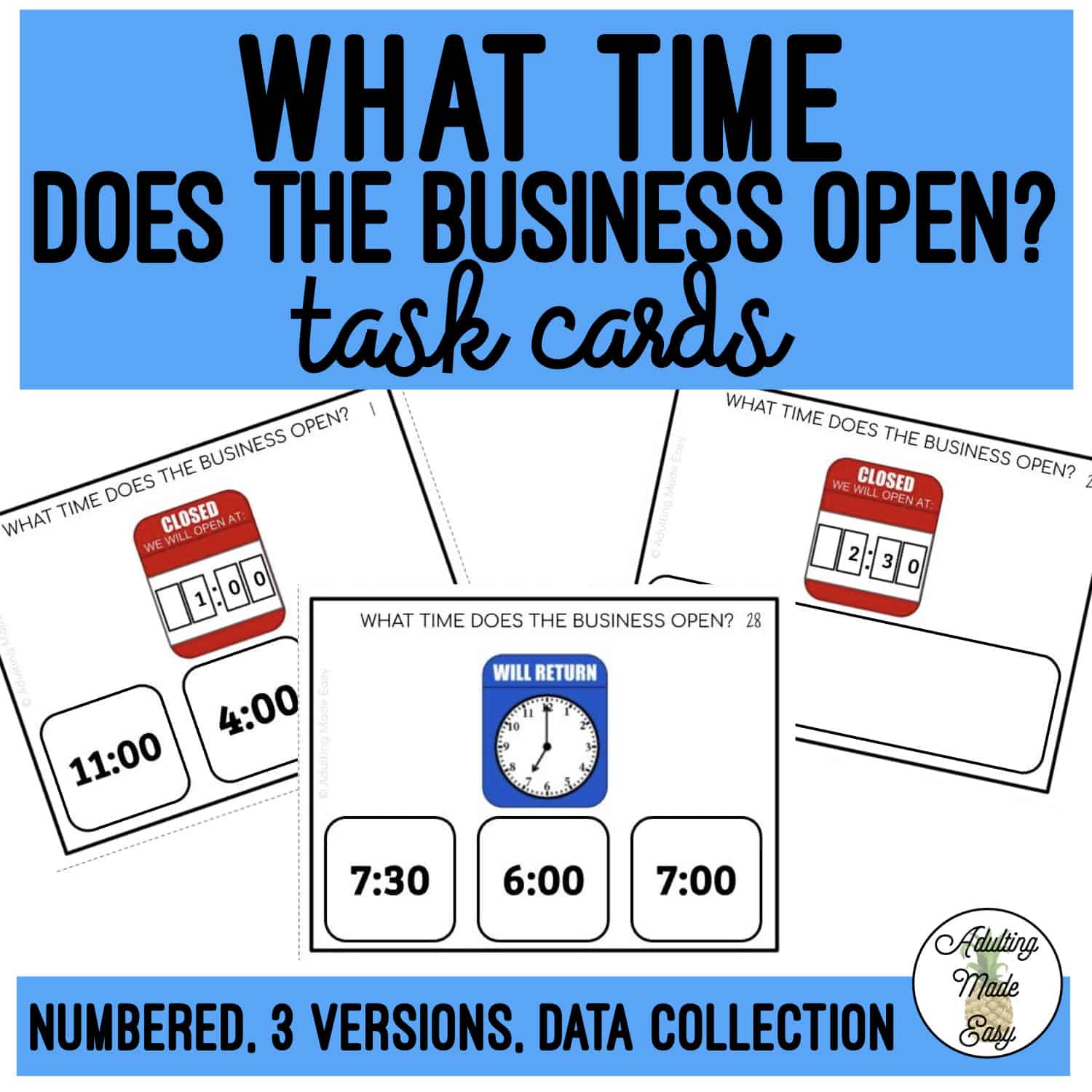 Differentiated life skills task cards to practice Functional Reading Time Includes “number sign” digital clock version, and analog clock version. Times are represented to the hour/o clock, quarter past :15, quarter til :45, half past :30. Great for career vocation job readiness.