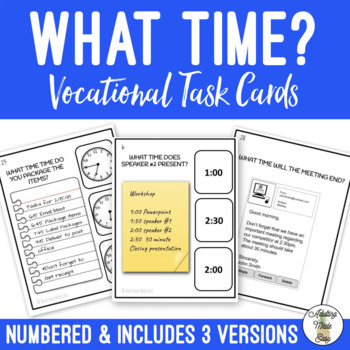 Task cards are differentiated with simple direct statements to vague statements that require you to compute what time to leave for work or what time a meeting will end.