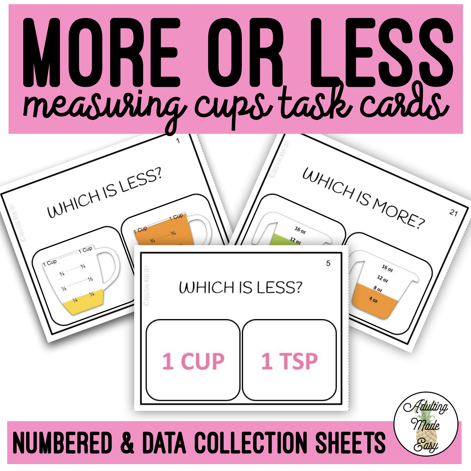 Functional reading & math task cards for cooking & kitchen that asks the student to identify which measuring cup is filled more or less.