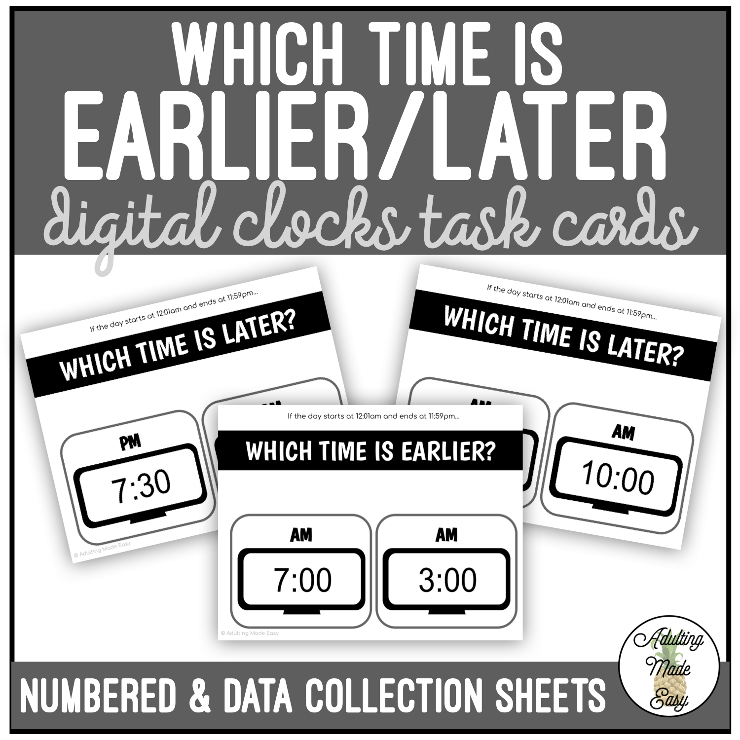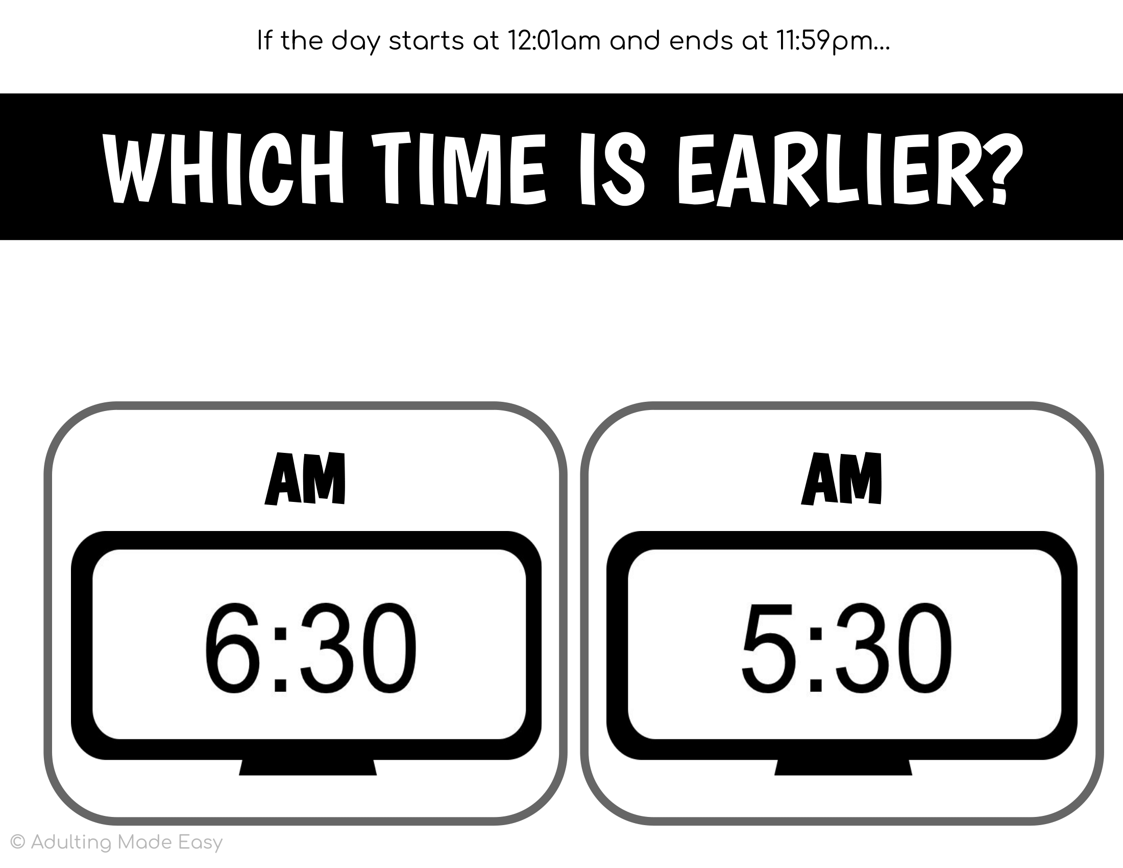 Students are given two clocks with AM or PM, and are to determine which time is later or earlier. A Time Line visual is provided to help students determine where the times fall. Age-appropriate activity for secondary special education students practicing life skills or time management. Simple, easy to ready, and printer friendly task cards, great for special education life skills.