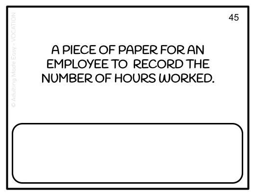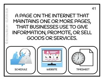 Vocabulary featured: Tasks, Sale, Wages, Prioritize, Website, Open, Closed, Sold, Business Hours, Business Card, Resume, References, Salary, Schedule, Transaction, Sort, Stock Shelves, Transportation, Timesheet, Teamwork, Meeting, Marketing, Now Hiring, Occupations, Office, On Time, Plan, Paycheck, Professional Attire, Quality Work, Employee, Email, Fax Machine, Internet, Interview, Job, Knowledge, Lunch Break, Letter of Recommendation, Manager, Application, Assemble, Bank Account, Customer, Cashier, Coworker, Clock In/Out, Career, Collaborate, Desk, Clearance, Discount, Union, and Vocation.