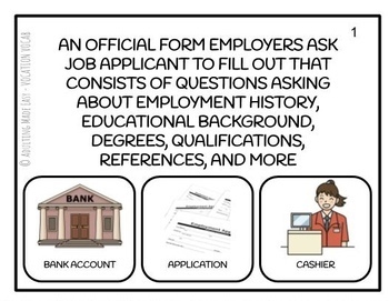 Career prep vocab words for special education, autism, or English language learners. Visual functional reading activity for common job readiness terminology.