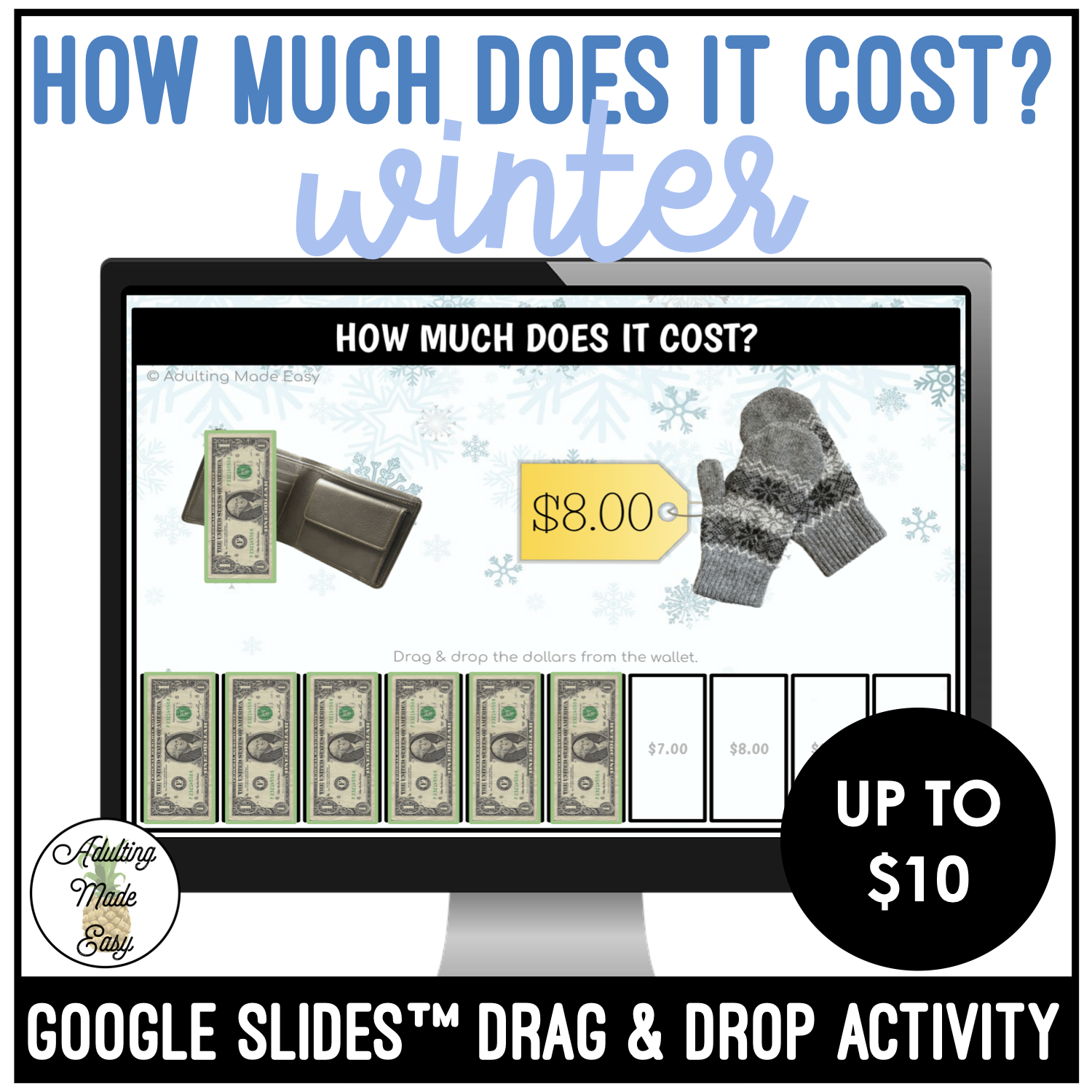 Digital Independent Work task box activity where students practice identifying how much items cost and then counting dollar bills to pay for the item. Price tags up to $10.00.
