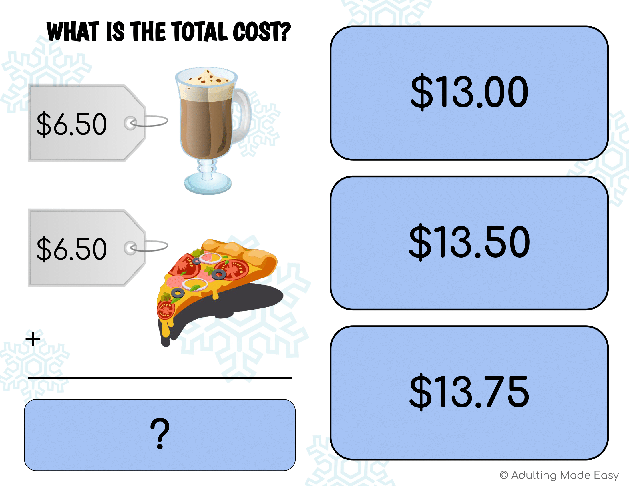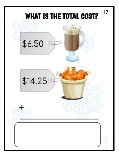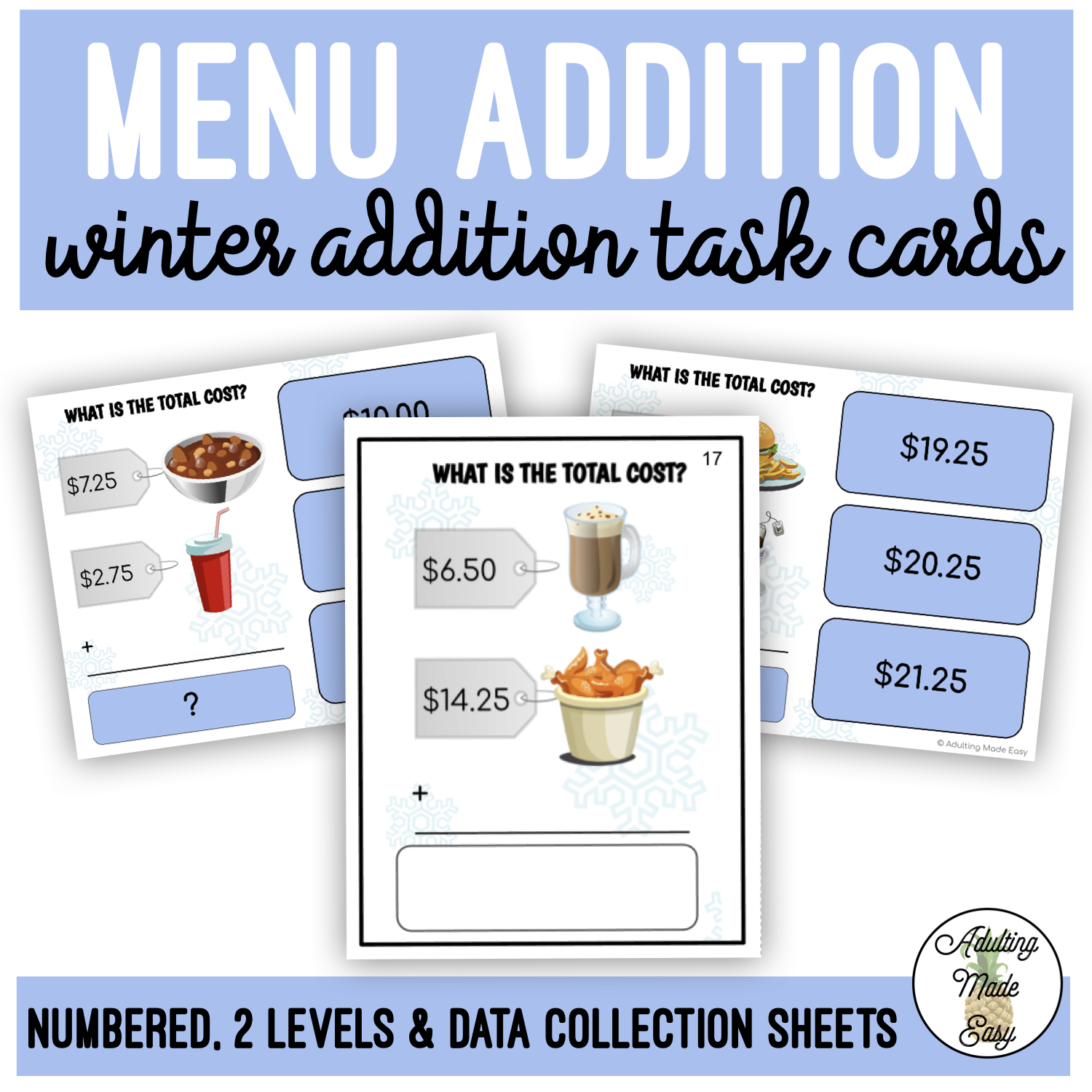 2 number addition problems & Reading using price tags and Ski Lodge snack bar food & drinks to do simple addition problems. This activity is formatted to make adding menu prices realistic and easier to understand for special education students. consumer math | December | January | Winter |