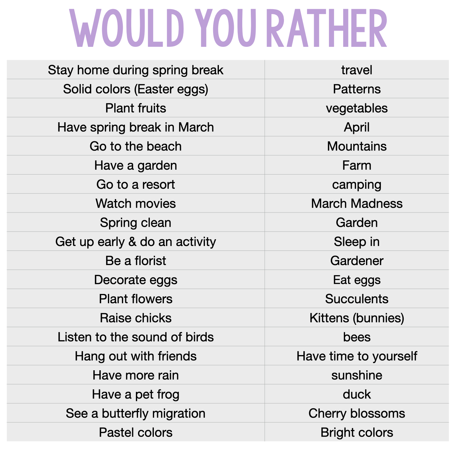 - Comes with 20 “would you rather” pages