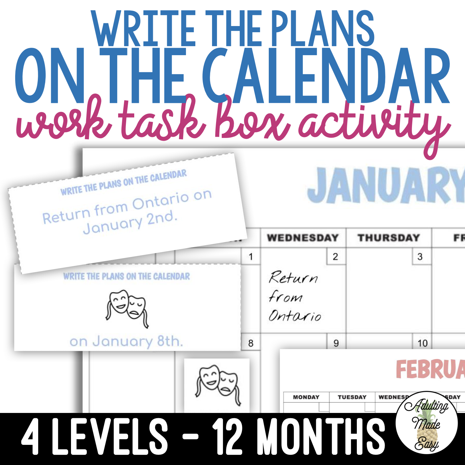 Have students practice organizational life skills & job skills with this simplified & differentiated task of putting plans onto a calendar. Great for IEP goals, independent work, or task box station!
